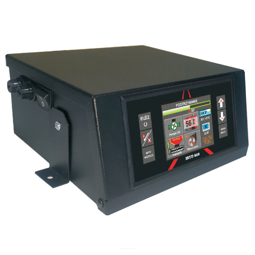 IRYD 610 jest regulatorem przeznaczonym do kontroli pracy kotła CO z podajnikiem ślimakowym. Regulator steruje rozbudowaną instalacją grzewczą. Specjalnie zaprojektowane menu umożliwia stopniowe uaktywnianie kolejnych funkcji oraz możliwości regulatora. Regulator ten posiada specjalny algorytm pracy pid fuzzy logic, który po określeniu przez użytkownika maksymalnej i minimalnej mocy kotła potrafi w sposób płynny dobierać odpowiednie dawki opału w zależności od obciążenia instalacji oraz rodzaju opału. Regulator steruje w sposób ciągły pracą dmuchawy dobierając do danej prędkości dmuchawy odpowiednią ilość opału. Ponadto wersja ta wyposażona jest w dodatkowy algorytm pid wpływający na temperaturę spalin regulujący moc kotła tak aby wartość temperatury spalin nie przekraczała maksymalnej zadanej przez użytkownika. Te nowoczesne algorytmy sterowania pozwalają zaoszczędzić na ilości spalanego opału, a co za tym idzie ma to korzystny wpływ na środowisko naturalne. Dodatkowo do regulatora można podłączyć do 5 modułów sterujących zaworem mieszającym, moduł internetowy oraz panel pokojowy co pozwala na znaczne rozbudowanie instalacji grzewczej.
