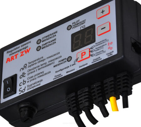 Opis podstawowy: Mikroprocesorowy regulator ART ZW jest regulatorem przeznaczonym do sterowania siłownikiem z pompą zaworu mieszającego w instalacjach C.O. Ponadto do regulatora można podłączyć termostat pokojowy lub PILOTA co jeszcze bardziej zwiększa jego funkcjonalność. Regulator ART ZW pozwala na rozbudowanie niskim kosztem istniejącej instalacji grzewczej bez wymiany regulatora sterującego pracą kotła. FUNKCJE - sterowanie siłownikiem zaworu mieszającego- obsługa PILOTA lub termostatu pokojowego. - funkcja anty-stop zapobiegająca zastaniu się pompy- funkcja anty-zamarzania- sterowanie pompą mieszacza- łatwa obsługa Dane techniczne 1. Symbol elementu pomiarowego w czujniku temperatury KTY 81-210 2. Maksymalna wilgotność otoczenia 75 % 3. Zabezpieczenie - szybkie bezpieczniki topikowe 3.15 A 4. Temperatura otoczenia podczas pracy urządzenia 5-45 °C 5. Napięcie zasilające ~230/50 V/Hz 6. Zakres pomiaru temperatury 0-100 °C 7. Obciążalność wyjść: pompy ~230V / siłownika ~230V 100/100 W 8. Pobór mocy (tylko regulatora) 2 W 9. Włączenie pompy w niskich temperaturach poniżej 5 °C 10. Włączanie pomp co 14 dni na 1 minutę - zapobiega to zastaniu się pompy po sezonie grzewczym (warunkiem działania tej funkcji jest włączony regulator)