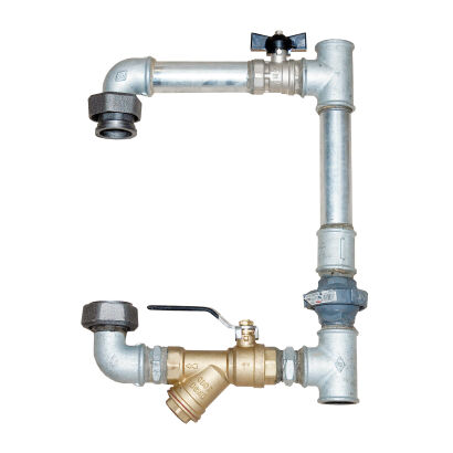 Układ obejścia pompy zabezpiecza kocioł przed nagłym wzrostem ciśnienia gorącej wody w przypadku zaniku zasilania sterownika i pompy c.o. Zawór różnicowy w trakcie normalnej pracy pompy jest zamknięty. W przypadku braku zasilania pompy zawór różnicowy otwiera się co powoduje ujście gorącej wody z pieca, która normalnie przepływa przez pracującą pompę. Zawory odcinające zamontowane w obejściu pompy umożliwiają wymontowanie pompy bez konieczności spuszczania wody z układu c.o. Wejście i wyjście obejścia mają rozmiar 1 1/2 cala. Pompa zamontowana jest na 1” przekroju. Oferowany zestaw przeznaczony jest do montażu ze standardowymi pompami c.o. o rozstawie króćców montażowych 180 mm (18 cm) np. 25 POr 40 C lub 25 POr 60 C Leszyńskiej Fabryki Pomp LFP; pompami Aqua Expert, Certus 25 RS-40 lub 25 RS-60. Obejście jest skręcone i uszczelnione, gotowe do montażu. Obejście poziome.
